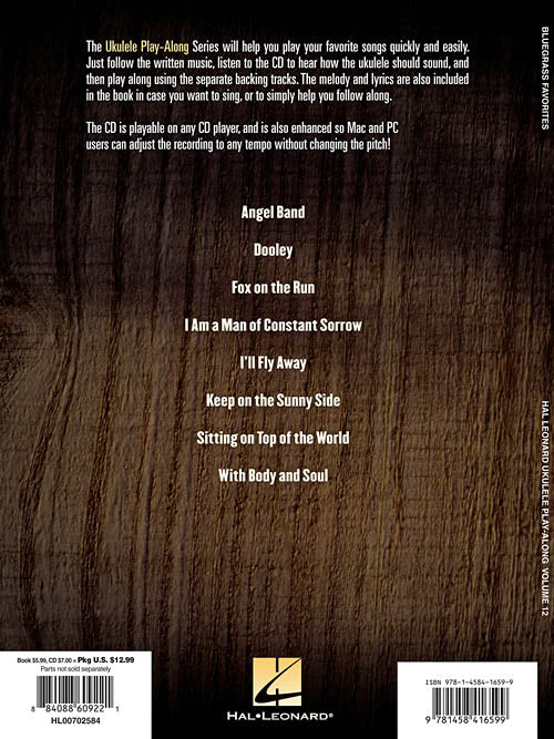 The Ukulele Play-Along series will help you play your favorite songs quickly and easily, with incredible backing tracks to help you sound like a bona fide pro! Just follow the written music, listen to the CD to hear how the ukulele should sound, and then play along with the separate backing tracks. The melody and lyrics are included in the book in case you want to sing, or to simply help you follow along. The CD is playable on any CD player, and also enhanced so Mac & PC users can adjust the recording to any tempo without changing the pitch! This volume includes 8 bluegrass classics: Angel Band · Dooley · Fox on the Run · I Am a Man of Constant Sorrow · I'll Fly Away · Keep on the Sunny Side · Sitting on Top of the World · With Body and Soul.