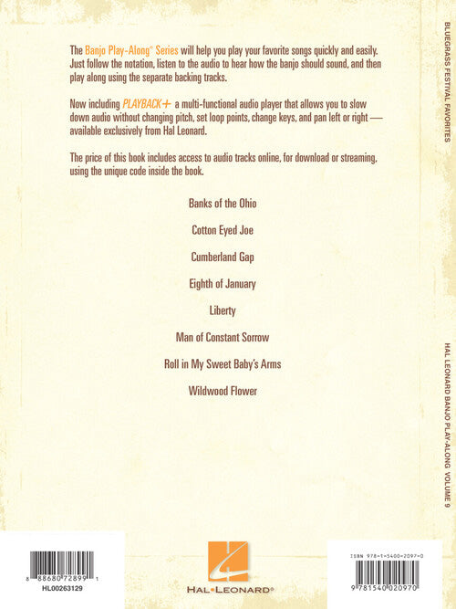 The Banjo Play-Along Series will help you play your favorite songs quickly and easily. Just follow the banjo tab, listen to the audio to hear how the banjo should sound, and then play along using the separate backing tracks. The book includes access to audio tracks online for download or streaming featuring Playback+, a multi-functional audio player that allows you to slow down the audio without changing pitch, set loop points, change keys, and pan left or right. This volume includes: Banks of the Ohio · Cotton Eyed Joe · Cumberland Gap · Eighth of January · Liberty · Man of Constant Sorrow · Roll in My Sweet Baby's Arms · Wildwood Flower.