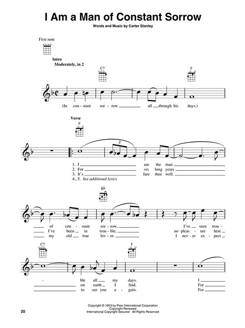 25 bluegrass favorites to jam with on your uke, including: Blue Moon of Kentucky · Dooley · Foggy Mountain Top · Fox on the Run · High on a Mountain Top · I Am a Man of Constant Sorrow · I'll Fly Away · Keep on the Sunny Side · Kentucky Waltz · The Long Black Veil · Rocky Top · Sitting on Top of the World · Turn Your Radio On · The Wreck of the Old '97 · and more.