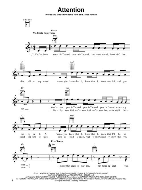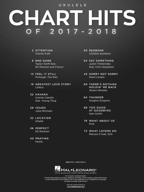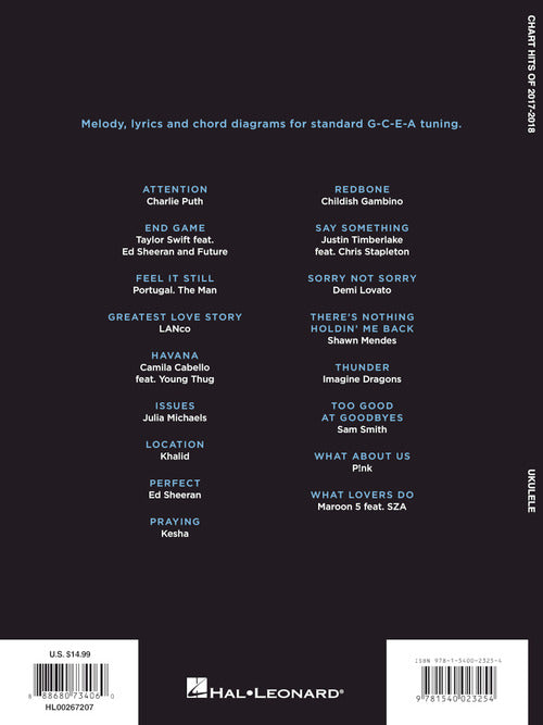 17 of the year's best made accessible for ukulele with melody, lyrics and chords in G-C-E-A tuning. Includes: Attention · End Game · Feel It Still · Greatest Love Story · Havana · Issues · Location · Perfect · Praying · Redbone · Say Something · Sorry Not Sorry · There's Nothing Holdin' Me Back · Thunder · Too Good at Goodbyes · What About Us · What Lovers Do.