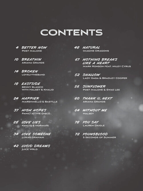 17 hot singles from 2018-2019 arranged for ukulele: Eastside (Benny Blanco, Halsey & Khalid) · Happier (Marshmello feat. Bastille) · High Hopes (Panic! At the Disco) · Natural (Imagine Dragons) · Shallow (Lady Gaga & Bradley Cooper) · Sunflower (from Spider-Man: Into the Spider-Verse) (Post Malone feat. Swae Lee) · Thank U, Next (Ariana Grande) · Without Me (Halsey) · Youngblood (5 Seconds of Summer) · and more.