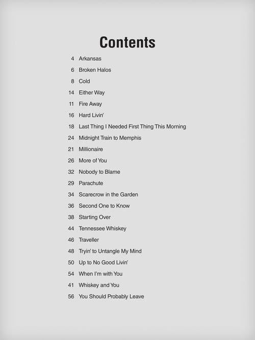 This collection features 22 Stapleton favorites arranged with lyrics, chord symbols, and guitar chord diagrams, including: Arkansas · Broken Halos · Millionaire · Parachute · Starting Over · Tennessee Whiskey · Traveller · You Should Probably Leave · and more.