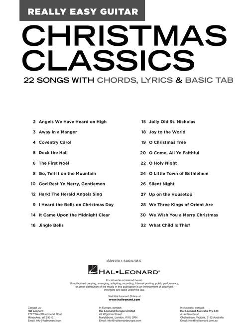 Easy-to-follow charts to get you playing right away are presented in this collection for all guitarists. Includes 22 popular Christmas carols in chords, lyrics and basic tab: Away in a Manger · Deck the Hall · God Rest Ye Merry, Gentlemen · It Came upon the Midnight Clear · Jingle Bells · O Holy Night · Silent Night · The Twelve Days of Christmas · We Wish You a Merry Christmas · What Child Is This? · and more.