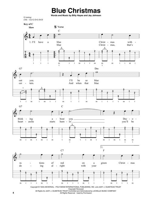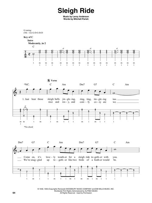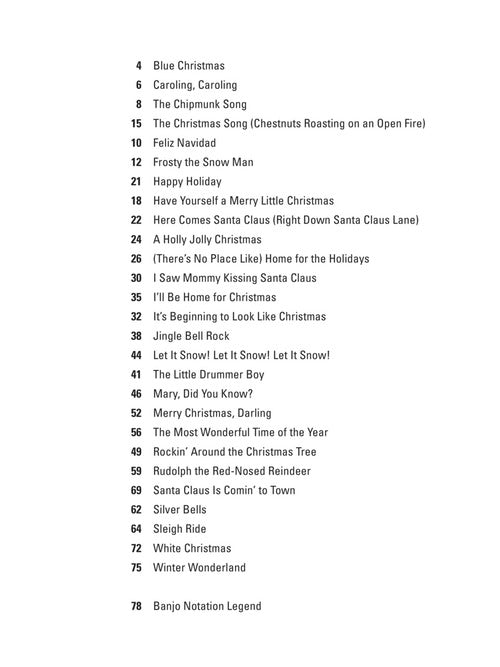 Celebrate the holiday season when you ring the banjo with 27 Christmas songs in this collection. Includes: Blue Christmas · The Christmas Song (Chestnuts Roasting on an Open Fire) · Frosty the Snow Man · Have Yourself a Merry Little Christmas · It's Beginning to Look like Christmas · Jingle Bell Rock · The Little Drummer Boy · Mary, Did You Know? · Rockin' Around the Christmas Tree · Silver Bells · White Christmas · and more.