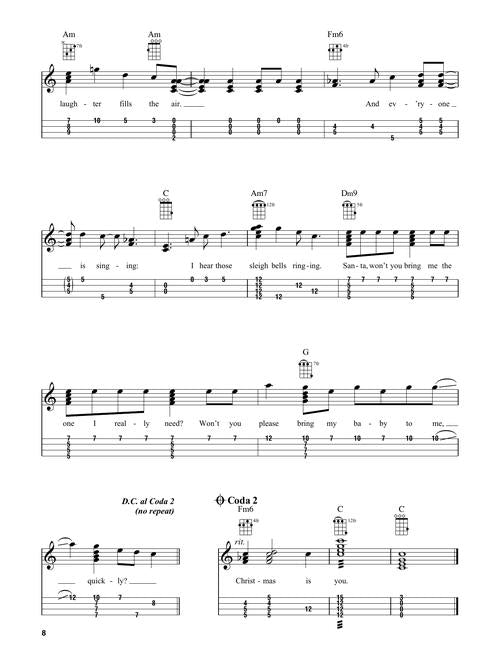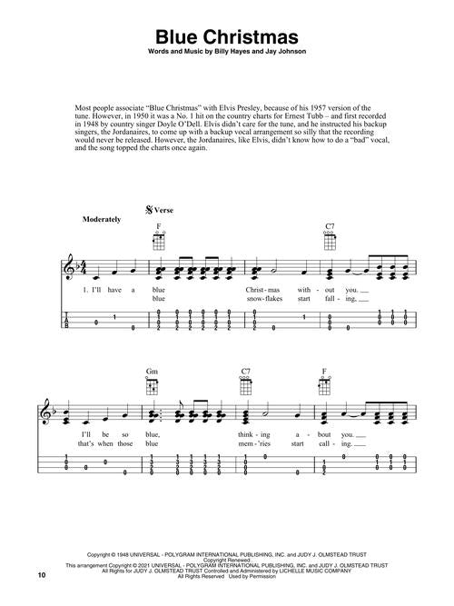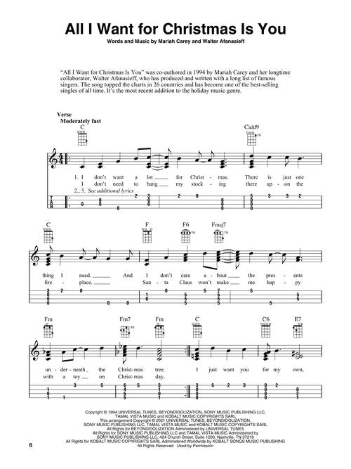 Christmas Songs for Fingerstyle Ukulele features 25 hit tunes, each presented two ways: solo fingerstyle arrangements for playing simple chord-melody instrumentals, with tab and chord diagrams included, and lyric-and-chord lead sheets for basic strumming and singing. The arrangements are by renowned author of 200 music collection and instruction books, Fred Sokolow, and include entertaining facts about the songs, their singers and composers. Songs include: All I Want for Christmas Is You · Blue Christmas · The Christmas Song (Chestnuts Roasting on an Open Fire) · Christmas Time Is Here · Feliz Navidad · Have Yourself a Merry Little Christmas · It's Beginning to Look like Christmas · Jingle Bell Rock · My Favorite Things · Rockin' Around the Christmas Tree · Santa Claus Is Comin' to Town · Silver Bells · What Are You Doing New Year's Eve? · White Christmas · and more.