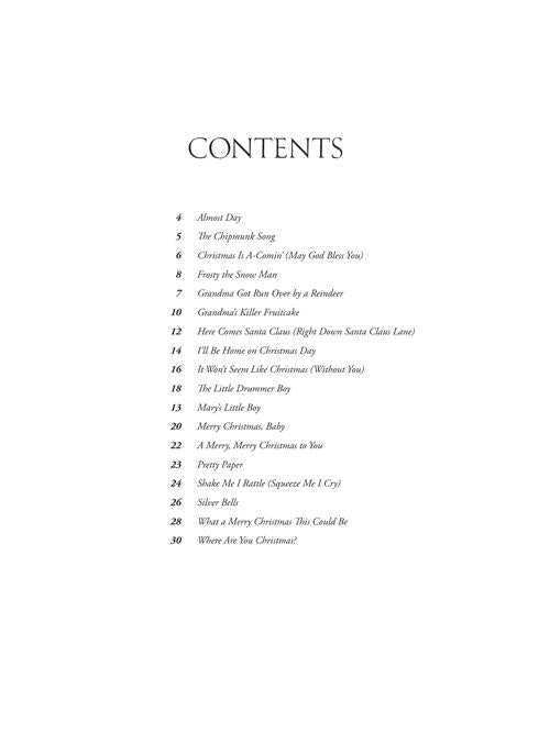 18 easy tunes to strum & sing in arrangements featuring melody, lyrics and chord diagrams for standard G-C-E-A tuning. Includes: The Chipmunk Song · Frosty the Snow Man · Grandma Got Run over by a Reindeer · Here Comes Santa Claus (Right down Santa Claus Lane) · The Little Drummer Boy · Silver Bells · and more.