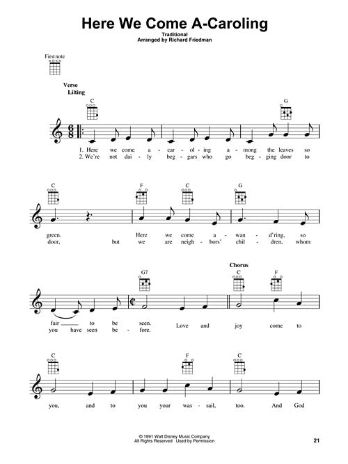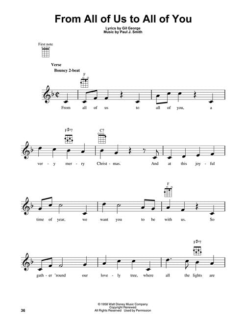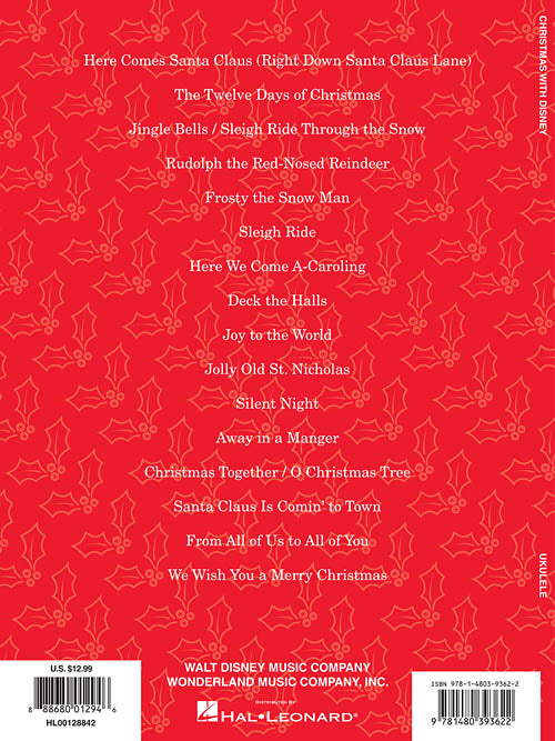 18 favorite Christmas songs and carols in renditions by Mickey Mouse and friends are presented in this fun holiday collection for the ukulele. Includes: Away in a Manger · Deck the Halls · From All of Us to All of You · Frosty the Snow Man · Here We Come A-Caroling · Joy to the World · Rudolph the Red-Nosed Reindeer · Silent Night · Sleigh Ride · The Twelve Days of Christmas · and more.