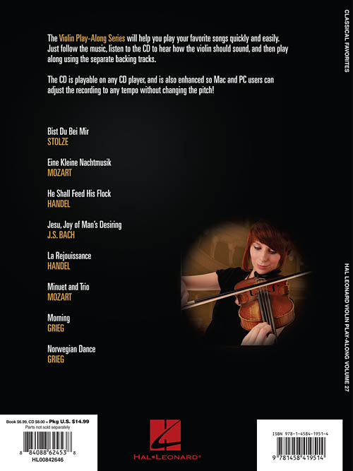 The Violin Play-Along series will help you play your favorite songs quickly and easily. Just follow the music, listen to the CD to hear how the violin should sound, and then play along using the separate backing tracks. With the melody and lyrics included in the book, you may also choose to sing along. The audio CD is playable on any CD player, and also enhanced so Mac & PC users can adjust the recording to any tempo without changing pitch! This volume includes the songs: Bist Du Bei Mir · Eine Kleine Nachtmusik (Serenade, First Movement Excerpt) · He Shall Feed His Flock · Jesu, Joy of Man's Desiring · La Rejouissance · Morning · and more.