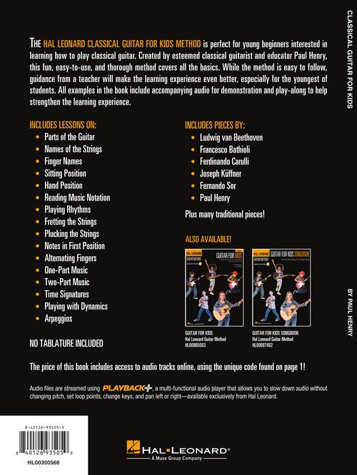 The Hal Leonard Classical Guitar for Kids Method is perfect for young beginners interested in learning how to play classical guitar. Created by esteemed classical guitarist and educator Paul Henry, this fun, easy-to-use, and thorough method covers all the basics. While the method is easy to follow, guidance from a teacher will make the learning experience even better, especially for the youngest of students. All examples in the book include accompanying audio for demonstration and play-along to help strengthen the learning experience. Includes pieces by Ludwig van Beethoven, Francesco Bathioli, Ferdinando Carulli, Joseph Kuffner, Fernando Sor, and Paul Henry, plus many traditional pieces! Includes lessons on: · Parts of the Guitar · Names of the Strings · Finger Names · String Position · Hand Position · Reading Music Notation · Playing Rhythms · Fretting the Strings · Plucking the Strings · Notes in First Position · Alternating Fingers · One-Part Music · Two-Part Music · Time Signatures · Playing with Dynamics · Arpeggios