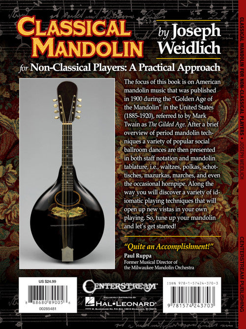 The focus of this book is on American mandolin music that was published circa 1900 during the Golden Age of the Mandolin in the United States (1885-1920), referred to by Mark Twain as The Gilded Age. After a brief overview of period mandolin techniques, a variety of popular social ballroom dances are then presented in both staff notation and mandolin tablature, including waltzes, polkas, schottisches, mazurkas, marches and even the occasional hornpipe. Along the way, you will discover a variety of idiomatic playing techniques that will open up new vistas in your own playing. So tune up your mandolin and get started!