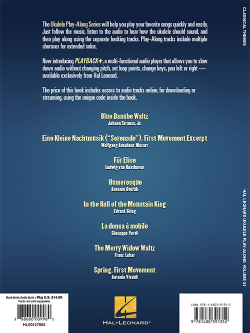 The Ukulele Play-Along series will help you play your favorites quickly and easily, with incredible backing tracks to help you sound like a bona fide pro! Just follow the written music, stream or download the online audio to hear how the ukulele should sound, and then play along with the separate backing tracks. The melody and lyrics are included in the book in case you want to sing, or to simply help you follow along. The audio is enhanced so Mac & PC users can adjust the recording to any tempo without changing the pitch! 8 selections: Blue Danube Waltz (Strauss) · Eine Kleine Nachtmusik (Serenade), First Movement Excerpt (Mozart) · Für Elise (Beethoven) · Humoresque (Dvorak) · In the Hall of the Mountain King (Grieg) · La donna é mobile (Verdi) · The Merry Widow Waltz (Lehar) · Spring, First Movement (Vivaldi).