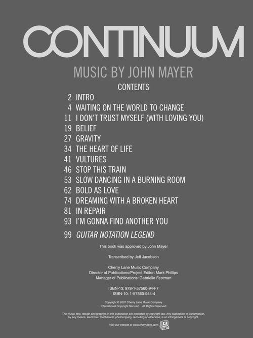 Mayer was recently lauded by Rolling Stone for his massive guitar talent. This folio features notes & tab for all 12 songs from his third CD, including the hits Gravity and Waiting on the World to Change, plus his cover of Hendrix's Bold as Love. Also includes an intro on the making of the album. Grammy Winner! Best Pop Vocal Album