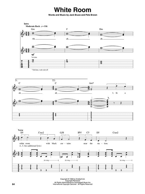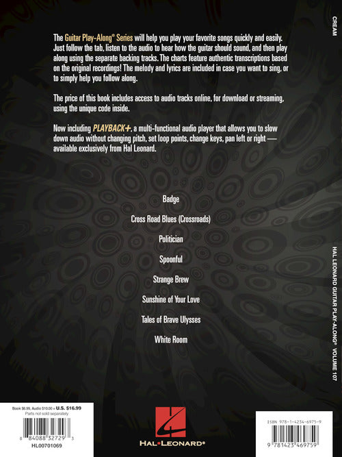 The Guitar Play-Along series will help you play your favorite songs quickly and easily! Just follow the tab, listen to the audio to hear how the guitar should sound, and then play along using the separate backing tracks. The melody and lyrics are also included in the book in case you want to sing, or to simply help you follow along. The audio is accessed online using the unique code inside each book and can be streamed or downloaded. The audio files include PLAYBACK+, a multi-functional audio player that allows you to slow down audio without changing pitch, set loop points, change keys, and pan left or right. 8 songs: Badge · Cross Road Blues (Crossroads) · Politician · Spoonful · Strange Brew · Sunshine of Your Love · Tales of Brave Ulysses · White Room.