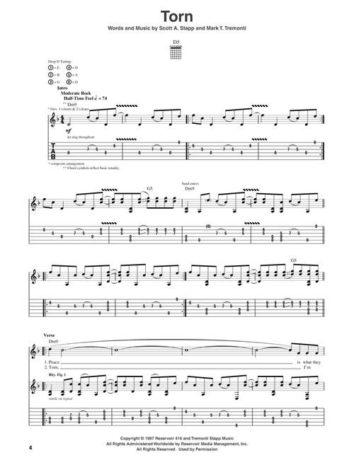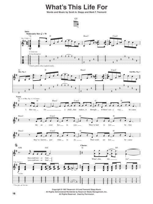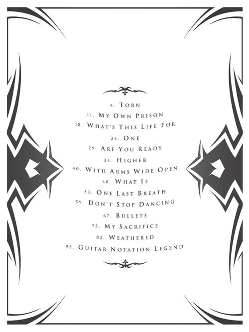 13 authentic guitar transcriptions of Mark Tremonti's work with Creed, presented in notes and tablature. Includes: Are You Ready? · Bullets · Don't Stop Dancing · Higher · My Own Prison · My Sacrifice · One · One Last Breath · Torn · Weathered · What If · What's This Life For · With Arms Wide Open.