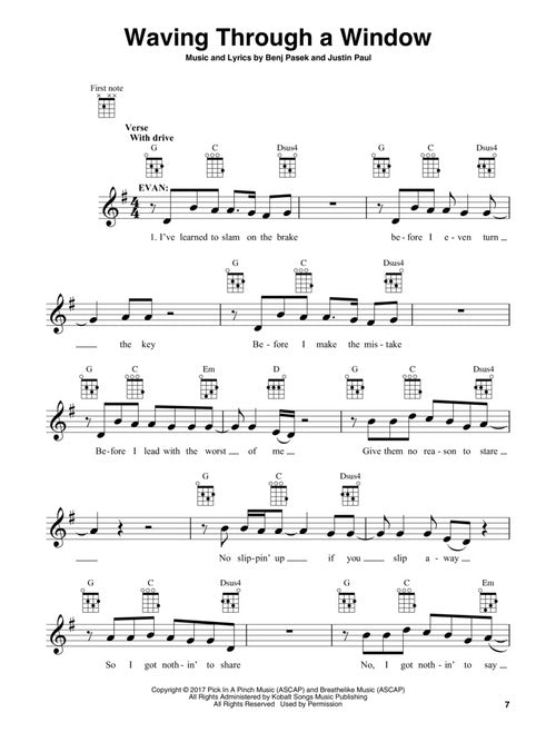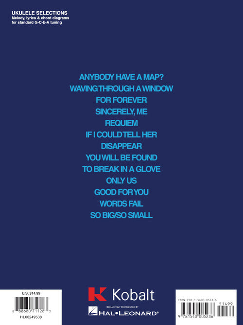 13 ukulele selections in standard G-C-E-A tuning with melody, lyrics and chord diagrams from the Broadway hit sensation Dear Evan Hansen. Songs include: Anybody Have a Map? · Disappear · For Forever · Good for You · If I Could Tell Her · Only Us · Requiem · Sincerely, Me · So Big/So Small · To Break in a Glove · Waving Through a Window · Words Fail · You Will Be Found.