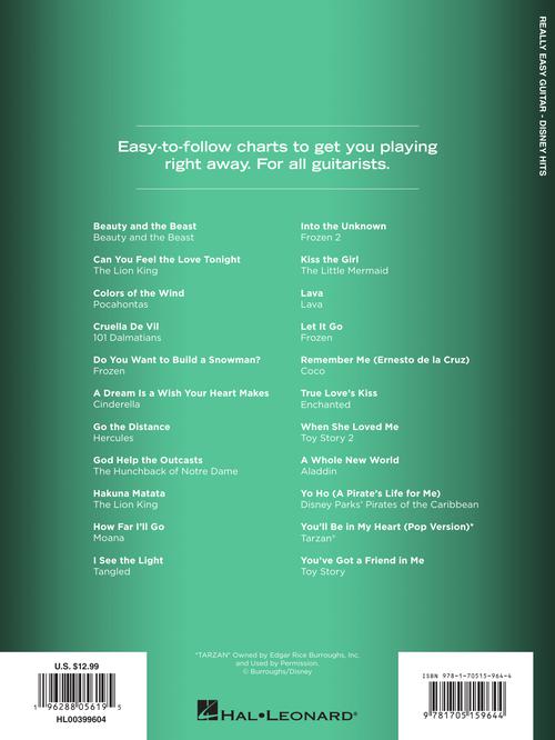 This collection features easy-to-follow charts to get you playing right away! It includes 22 songs from Disney's biggest hits with chords, lyrics, and guitar grids. Songs include: Beauty and the Beast · Can You Feel the Love Tonight · Colors of the Wind · Hakuna Matata · How Far I'll Go · Into the Unknown · Kiss the Girl · Let It Go · Remember Me (Ernesto de la Cruz) · A Whole New World · You'll Be in My Heart (Pop Version) · You've Got a Friend in Me · and more.