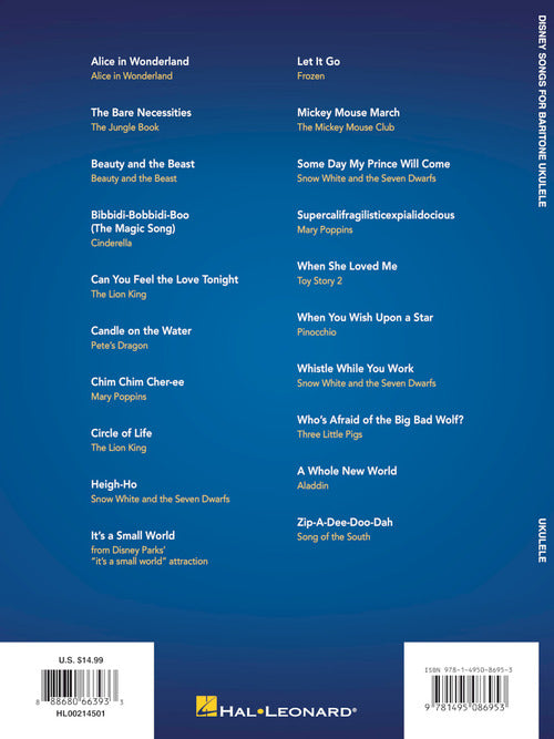 If you love Disney and play the baritone uke, this collection is for you! Includes 20 favorite songs, including: Beauty and the Beast · Can You Feel the Love Tonight · Heigh-Ho · It's a Small World · Let It Go · Mickey Mouse March · Some Day My Prince Will Come · Supercalifragilisticexpialidocious · When You Wish upon a Star · A Whole New World · Zip-A-Dee-Doo-Dah · and more.