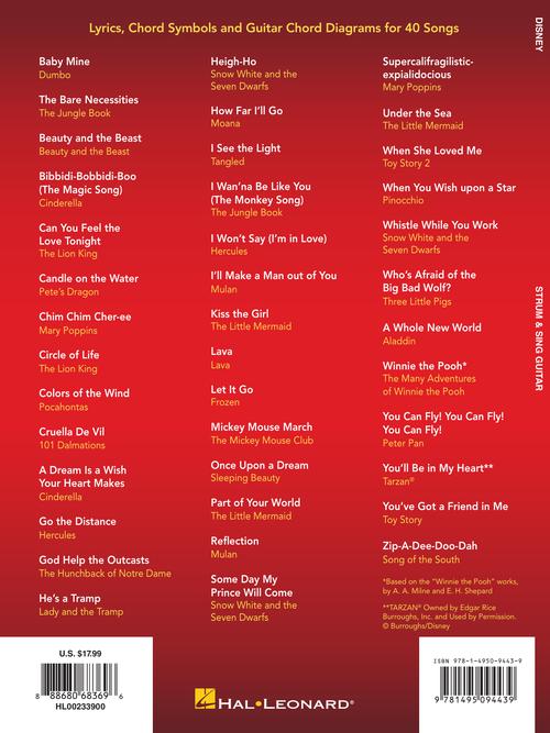 Young guitar students will love playing their favorite Disney tunes with this collection of 40 songs arranged in lyrics, chord symbols & guitar chord diagrams. Includes: Beauty and the Beast · Can You Feel the Love Tonight (from The Lion King) · A Dream Is a Wish Your Heart Makes (from Cinderella) · How Far I'll Go (from Moana) · I See the Light (from Tangled) · Kiss the Girl (from The Little Mermaid) · Let It Go (from Frozen) · Reflection (from Mulan) · Supercalifragilisticexpialidocious (from Mary Poppins) · When You Wish upon a Star (from Pinocchio) · A Whole New World (from Aladdin) · You've Got a Friend in Me (from Toy Story) · and more.