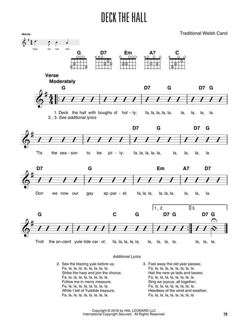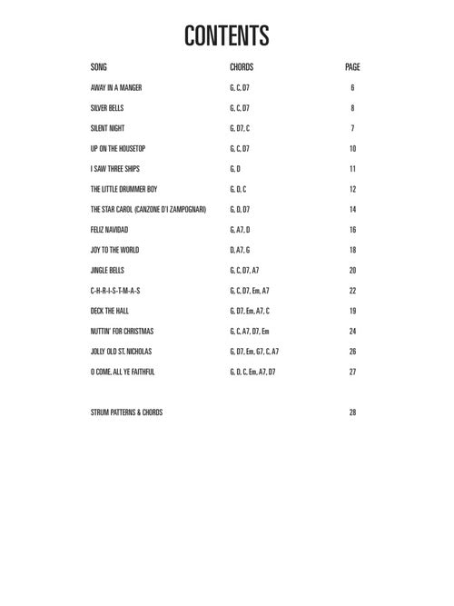 Strum along with your favorite holiday hits, correlated to work with any guitar method book 1. The songs are presented in order of difficulty - featuring 15 songs in all. Includes: Away in a Manger · C-H-R-I-S-T-M-A-S · Deck the Hall · Feliz Navidad · I Saw Three Ships · Jingle Bells · Jolly Old St. Nicholas · Joy to the World · The Little Drummer Boy · Nuttin' for Christmas · O Come, All Ye Faithful · Silent Night · Silver Bells · The Star Carol (Canzone D'i Zampognari) · Up on the Housetop.