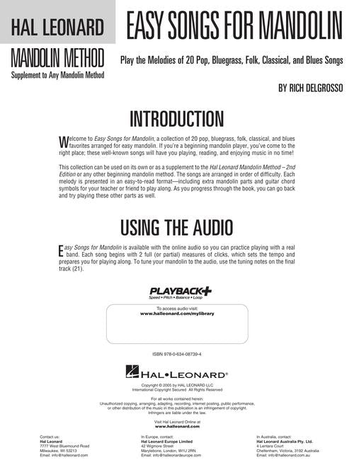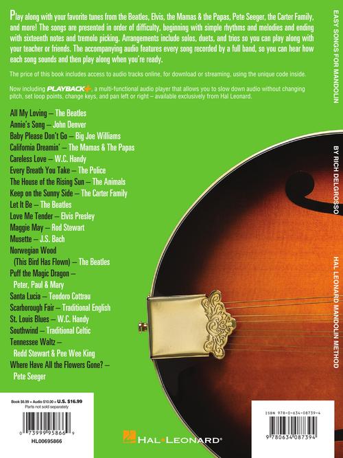 20 easy songs to play as you learn mandolin, with an accompanying audio tracks containing: All My Loving · Annie's Song · Baby Please Don't Go · California Dreamin' · Careless Love · Every Breath You Take · The House of the Rising Sun · Keep on the Sunny Side · Let It Be · Love Me Tender · Maggie May · Musette · Norwegian Wood (This Bird Has Flown) · Puff the Magic Dragon · Santa Lucia · Scarborough Fair · Southwind · St. Louis Blues · Tennessee Waltz · Where Have All the Flowers Gone? Audio is accessed online using the unique code inside the book and can be streamed or downloaded. The audio files include PLAYBACK+, a multi-functional audio player that allows you to slow down audio without changing pitch, set loop points, change keys, and pan left or right.