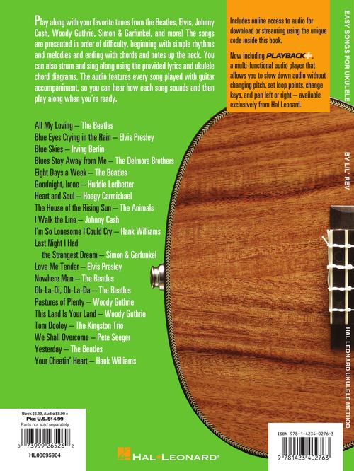 Play along with your favorite tunes from the Beatles, Elvis, Johnny Cash, Woody Guthrie, Simon & Garfunkel, and more! The songs are presented in the order of difficulty, beginning with simple rhythms and melodies and ending with chords and notes up the neck. You can also strum and sing along using the provided lyrics and ukulele chord diagrams. The online audio files feature every song played with guitar accompaniment, so you can hear how each song sounds and then play along when you're ready. PLAYBACK+ features also let you adjust the tempo without changing pitch and loop challenging passages to aid in practice! Songs include: I Walk the Line · Ob-La-Di, Ob-La-Da · Tom Dooley · We Shall Overcome · Your Cheatin' Heart · and more.