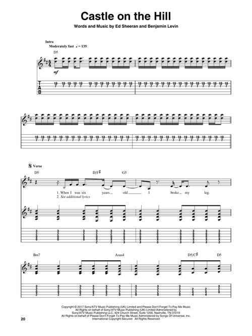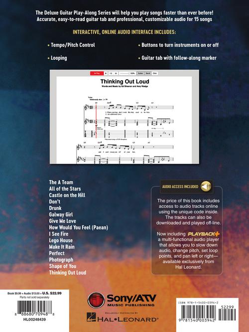 The Deluxe Guitar Play-Along series will help you play songs faster than ever before! Accurate, easy-to-read guitar tab and professional, customizable audio for 15 songs. The interactive, online audio interface includes tempo/pitch control, looping, buttons to turn instruments on or off, and guitar tab with follow-along marker. The price of this book includes access to audio tracks online using the unique code inside. The tracks can also be downloaded and played offline. Now including PLAYBACK+, a multi-functional audio player that allows you to slow down audio, change pitch, set loop points, and pan left or right - available exclusively from Hal Leonard. This volume includes 15 songs: The A Team · All of the Stars · Castle on the Hill · Don't · Drunk · Galway Girl · Give Me Love · How Would You Feel (Paean) · I See Fire · Lego House · Make It Rain · Perfect · Photograph · Shape of You · Thinking Out Loud.