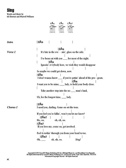 15 songs presented simply with chords and lyrics from this hot singer/songwriter for guitarists to strum and sing: The A Team · All of the Stars · Bloodstream · Don't · Drunk · Give Me Love · I See Fire · I'm a Mess · Kiss Me · Lego House · One · Photograph · Sing · Small Bump · Thinking Out Loud.