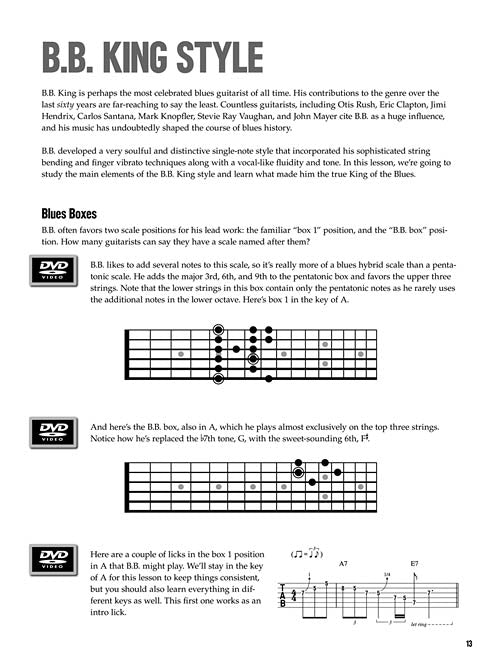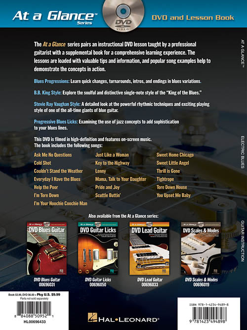 A first of its kind, the At a Glance series pairs an instructional DVD lesson taught by a professional guitarist with a supplemental book for a comprehensive learning experience. Each book/DVD features several lessons pertaining to one topic, and the hi-def DVD lessons feature on-screen music. The lessons are loaded with valuable tips and information, and popular song examples help to demonstrate the concepts in action. Electric Blues - At a Glance features these lessons: Blues Progressions, B.B. King Style, Stevie Ray Vaughan Style, and Progressive Licks. Songs include: Ask Me No Questions · Cold Shot · Couldn't Stand the Weather · I'm Tore Down · Just like a Woman · Mama, Talk to Your Daughter · Sweet Home Chicago · Thrill Is Gone · Tightrope · and more!