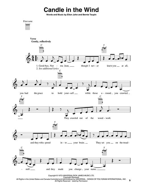 20 Elton favorites arranged for uke, including: Bennie and the Jets · Can You Feel the Love Tonight · Candle in the Wind · Crocodile Rock · Daniel · Don't Go Breaking My Heart · Goodbye Yellow Brick Road · I Guess That's Why They Call It the Blues · Rocket Man (I Think It's Gonna Be a Long Long Time) · Sad Songs (Say So Much) · Saturday Night's Alright (For Fighting) · Your Song · and more.
