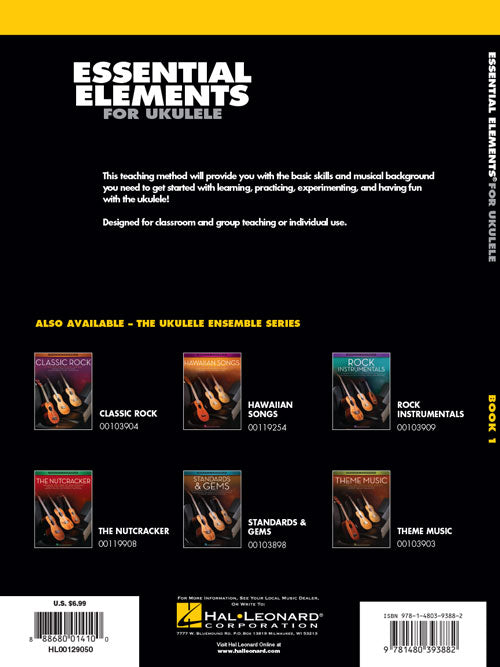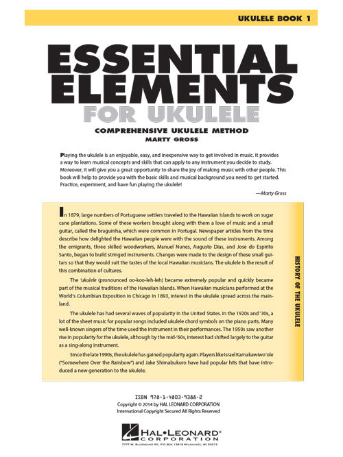 Playing the ukulele is an enjoyable, easy, and inexpensive way to get involved in music. It provides a way to learn musical concepts and skills that can apply to any instrument you decide to study. Moreover, it will give you a great opportunity to share the joy of making music with other people. This book will help to provide you with the basic skills and musical background you need to get started. This carefully crafted method emphasizes chord strumming skills; teaching students HOW to practice; note reading exercises; chord challenges to learn how to figure out chord progressions; tab reading; and more. It also includes nearly 30 familiar songs that students can play while still learning, including: All My Loving · Home on the Range · Hound Dog · Jambalaya (On the Bayou) · La Bamba · The Lion Sleeps Tonight · The Rainbow Connection · Take Me Out to the Ballgame · and more! Practice, experiment, and have fun playing the ukulele! Named The Best Ukulele Method for Beginners by Wirecutter: ...Essential Elements for Ukulele Book 1 emerged as our clear favorite. Surprisingly, it's one of the few books that start out by explaining chordal playing instead of single-note playing and playing chords is what almost all beginners really want to do on uke, since that gets them directly into playing songs. We like that Essential Elements for Ukulele includes some useful, unintimidating lessons on music theory, and that it offers chord and strum charts in the back...