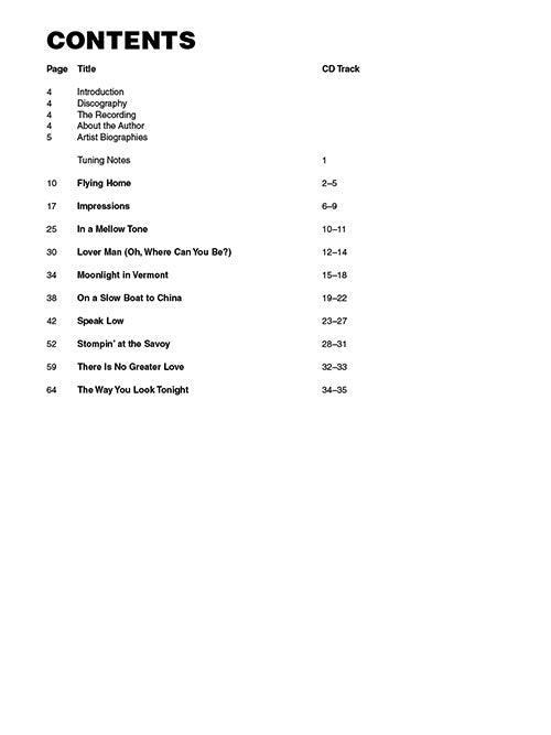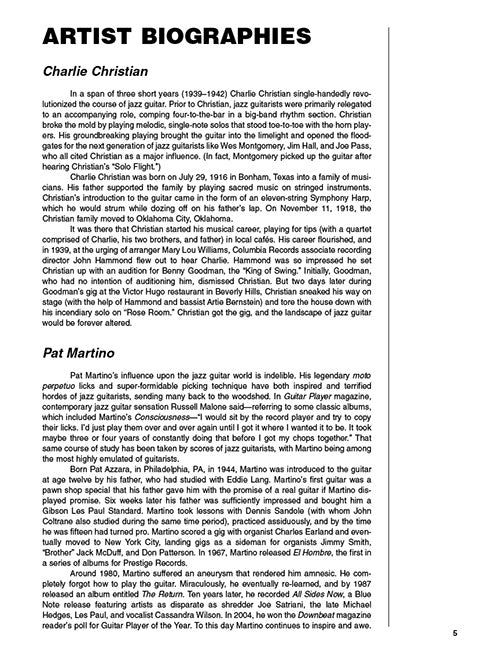 Explore the classic songs and improvisations of jazz's greatest guitarists! This book/CD pack covers 10 songs, including: Flying Home (Charlie Christian) · Impressions (Pat Martino) · In a Mellow Tone (Joe Pass) · Lover Man (Oh, Where Can You Be?) (Django Reinhardt) · Speak Low (Grant Green) · The Way You Look Tonight (Wes Montgomery) · and more.