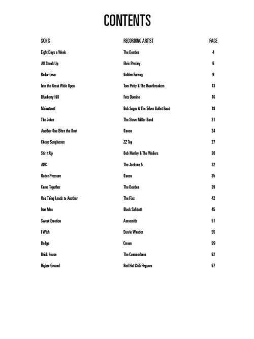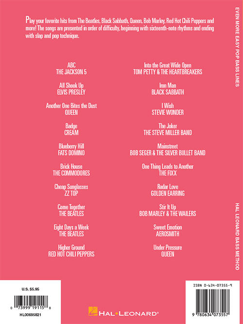 This songbook correlates with Book 3 of the Hal Leonard Bass Method, giving beginning students great pop & rock songs to play while they are still learning! Includes 20 favorites: ABC · Another One Bites the Dust · Badge · Brick House · Cheap Sunglasses · Come Together · Higher Ground · Into the Great Wide Open · Iron Man · The Joker · Radar Love · Sweet Emotion · Under Pressure · more. The songs are presented in order of difficulty, beginning with sixteenth-note rhythms and ending with slap and pop technique.