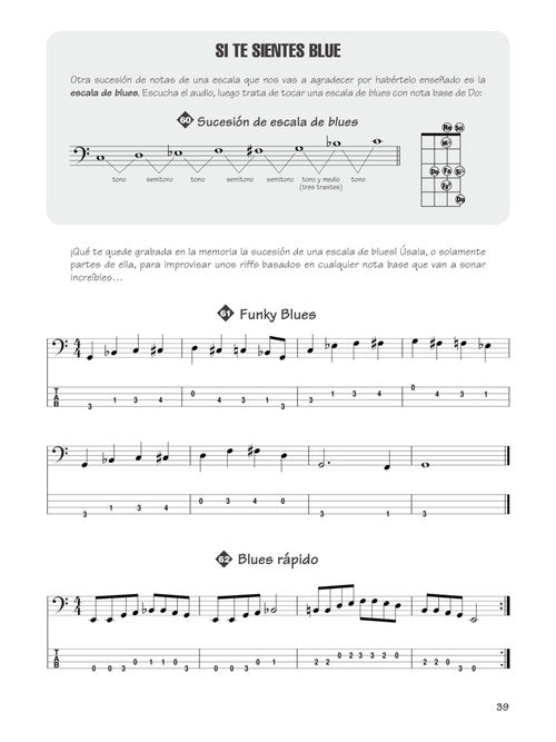 Everything you need to know about playing the bass, including music notation, tablature, riffs, licks, and scales, syncopation, and rock and blues styles. Method Book 1 includes 75 songs and examples.