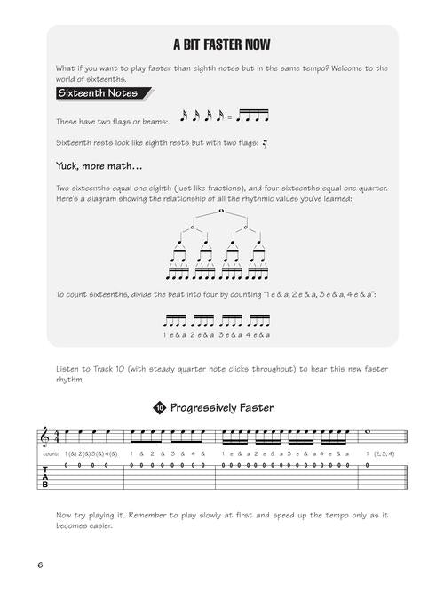 Covers power chords, barre chords, riffs, slides, bends, strumming patterns, fifth position, rock, blues and other styles. Includes 92 songs and audio examples. Audio is accessed online using the unique code inside the book and can be streamed or downloaded. The audio files include PLAYBACK+, a multi-functional audio player that allows you to slow down audio without changing pitch, set loop points, change keys, and pan left or right.