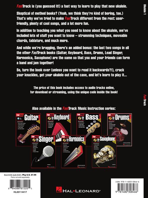 Unlike stodgy methods, FastTrack books are fun and user-friendly, with plenty of cool songs! In addition to teaching you what you need to know about the ukulele, we've included lots of stuff you want to know - strumming techniques, moveable chords, tablature, and much more. Plus, the last two songs in all of our FastTrack books are the same, so you and your friends can form a band and jam. Features 65 songs and examples to get you up and running on the uke!