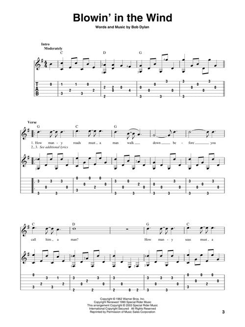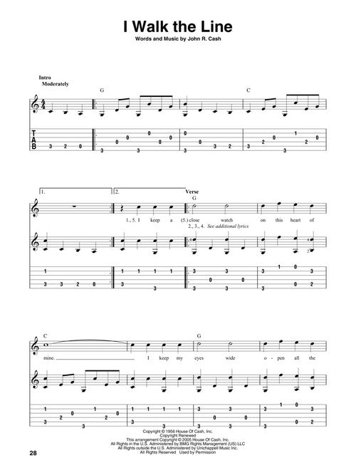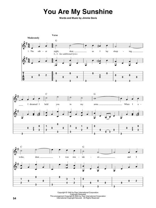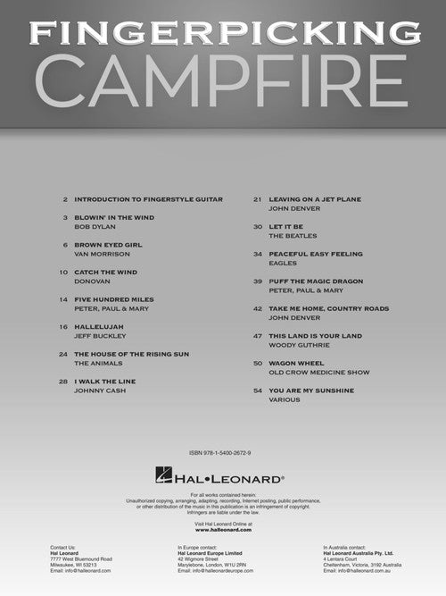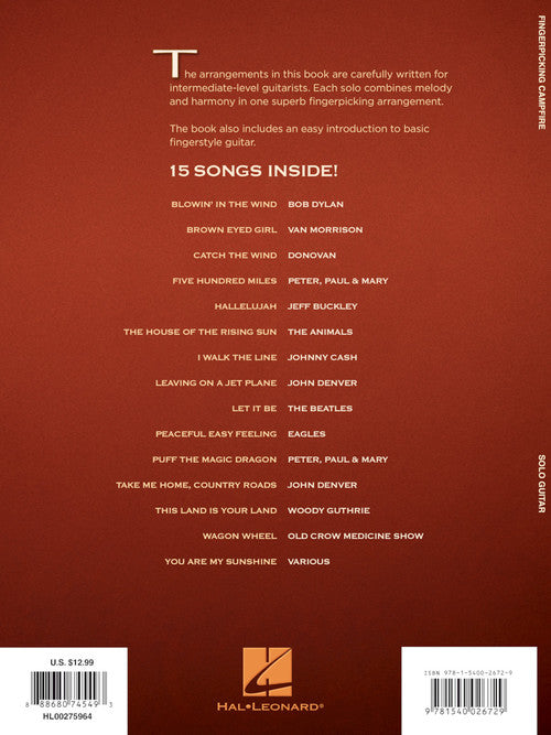 Each solo in this collection has been written for intermediate level guitarists, combining melody and harmony in one superb fingerpicking arrangement. Includes an easy introduction to basic fingerstyle guitar. Songs include: Blowin' in the Wind (Bob Dylan) · Brown Eyed Girl (Van Morrison) · Catch the Wind (Donovan) · Five Hundred Miles (Peter, Paul & Mary) · Hallelujah (Jeff Buckley) · The House of the Rising Sun (The Animals) · I Walk the Line (Johnny Cash) · Leaving on a Jet Plane (John Denver) · Let It Be (The Beatles) · Peaceful Easy Feeling (The Eagles) · Puff the Magic Dragon (Peter, Paul & Mary) · Take Me Home, Country Roads (John Denver) · This Land Is Your Land (Woody Guthrie) · Wagon Wheel (Old Crow Medicine Show) · You Are My Sunshine.