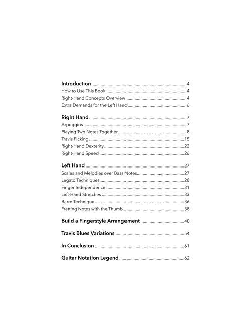 This technique handbook for the fingerstyle guitarist will help you master the techniques and styles of players like Merle Travis, Chet Atkins, Leo Kottke, and Tommy Emmanuel. Refine your left- and right-hand skills with focused exercises and helpful tips, learn how to build a compelling fingerstyle arrangement for guitar, and take total control of your practice routine. To help guide you through the exercises, 8 demonstration videos are included for online streaming or download, and many of the videos feature both slow and fast versions of the exercise. The lessons presented in this book are bound to take your guitar playing to the next level! Workouts in this book focus on topics like: right-hand dexterity; right-hand speed; useful pima patterns; left-hand stretches; finger independence; legato techniques; barre techniques; Travis picking; arpeggios and scales; building fingerstyle arrangements; and much more!
