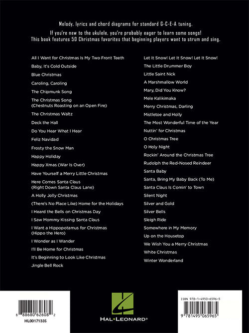 This awesome collection features 50 Christmas favorites for ukulele in melody, lyrics, and chord diagrams. No uke player will want to be without this book during the holiday season! Songs include: Blue Christmas · The Christmas Song (Chestnuts Roasting on an Open Fire) · Deck the Hall · Frosty the Snow Man · Have Yourself a Merry Little Christmas · I Want a Hippopotamus for Christmas (Hippo the Hero) · Let It Snow! Let It Snow! Let It Snow! · The Little Drummer Boy · Mele Kalikimaka · Rudolph the Red-Nosed Reindeer · Silent Night · Sleigh Ride · Up on the Housetop · Winter Wonderland · and many more.