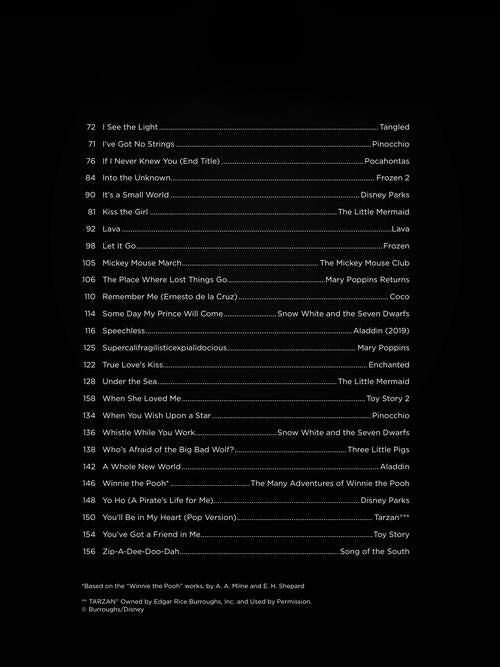 If you've been learning ukulele for a little while, you are probably eager to put your new skills to work and learn some familiar songs. This book features 50 favorite Disney songs arranged with melody, lyrics and chord diagrams for standard G-C-E-A tuning. Songs include: The Bare Necessities · Beauty and the Beast · Can You Feel the Love Tonight · Chim Chim Cher-ee · Do You Want to Build a Snowman? · Evermore · Hakuna Matata · How Does a Moment Last Forever · How Far I'll Go · I See the Light · Into the Unknown · Lava · Let It Go · The Place Where Lost Things Go · Remember Me (Ernesto de la Cruz) · Speechless · Supercalifragilisticexpialidocious · True Love's Kiss · Under the Sea · When She Loved Me · A Whole New World · You've Got a Friend in Me · and more!