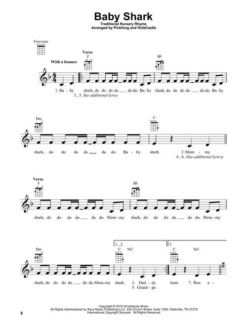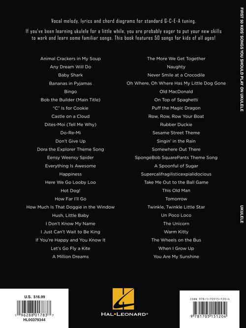 When kids start to play the ukulele, they want to start playing their favorite songs as soon as possible! This collection features 50 songs for children who are ready to step into songbooks, with melody, lyrics, and chord diagrams. Includes: Baby Shark · Bob the Builder (Main Title) · Do-Re-Mi · Dora the Explorer Theme Song · Eensy Weensy Spider · How Far I'll Go · If You're Happy and You Know It · A Million Dreams · On Top of Spaghetti · Puff the Magic Dragon · Sesame Street Theme · SpongeBob SquarePants Theme Song · Warm Kitty · You Are My Sunshine · and more.