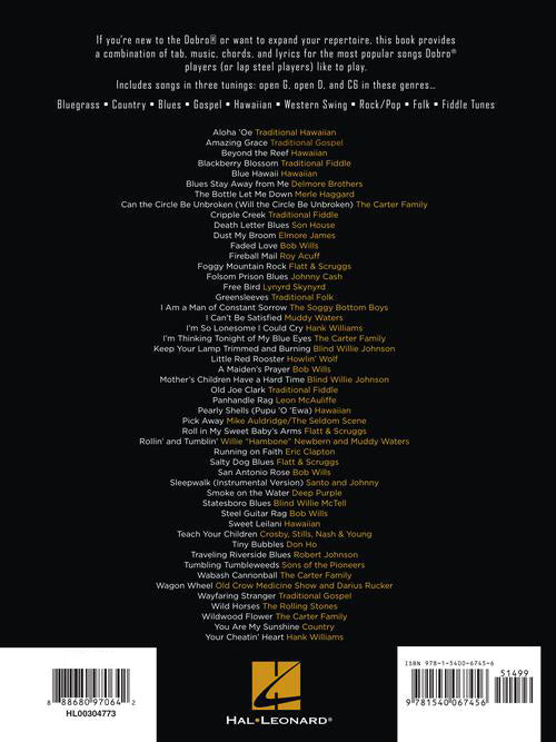 If you're new to the Dobro® or want to expand your repertoire, this book provides a combination of tab, music, chords, and lyrics for the most popular songs Dobro players (or lap steel players) like to play. Features songs in three tunings: open G, open D, and C6 in these genres, including: Amazing Grace · Blue Hawaii · Can the Circle Be Unbroken · Free Bird · I Am a Man of Constant Sorrow · Keep Your Lamp Trimmed and Burning · Old Joe Clark · Salty Dog Blues · Teach Your Children · Wild Horses · Your Cheatin' Heart · and more.