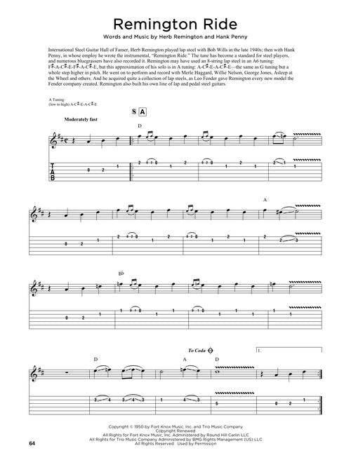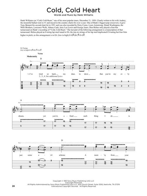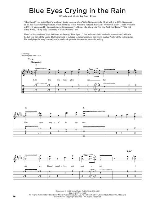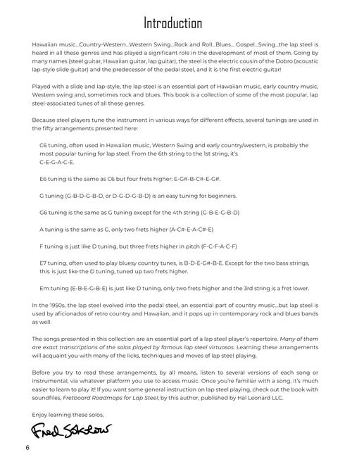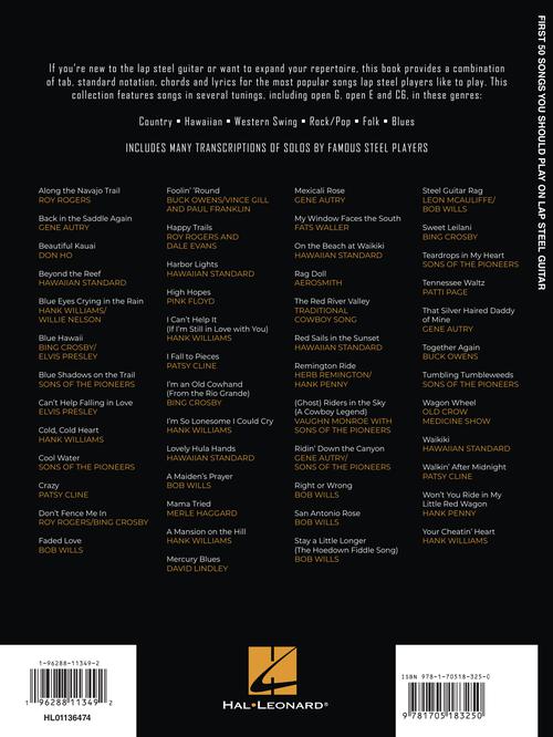 This one-of-a-kind collection arranged by Fred Sokolow features accessible, must-know songs for anyone ready to start playing lap steel guitar, or any player wanting to expand their repertoire. Each song is presented in a combination of tab, standard notation, chords, and lyrics for the most popular songs lap steel players like to play. This collection features songs in several tunings, including open G, open E and C6, in these genres: country, Hawaiian, Western swing, rock/pop, folk, and blues. It also includes many transcriptions of solos by famous steel players. Songs include: Back in the Saddle Again · Blue Eyes Crying in the Rain · Can't Help Falling in Love · Crazy · Faded Love · Happy Trails · I'm So Lonesome I Could Cry · Mama Tried · (Ghost) Riders in the Sky (A Cowboy Legend) · Together Again · Waikiki · Walkin' After Midnight · Won't You Ride in My Little Red Wagon · Your Cheatin' Heart · and more.
