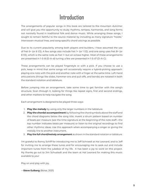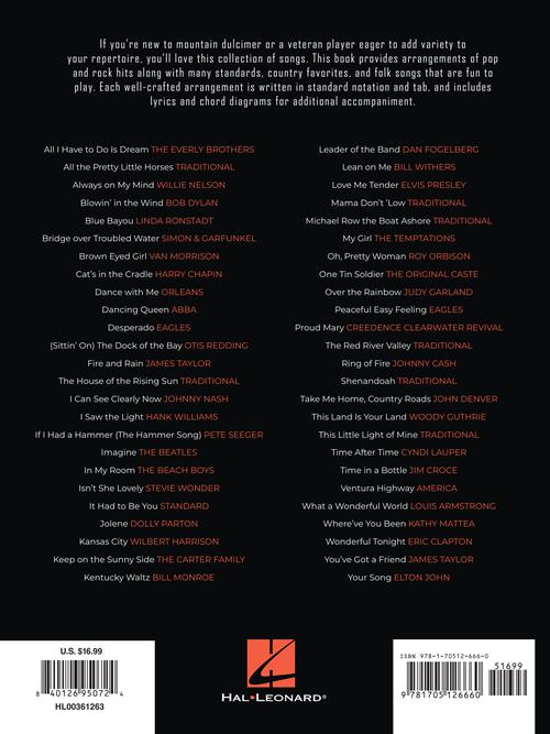 This new addition to the First 50 series is a one-of-a-kind collection of accessible, well-known traditional, folk and pop songs arranged expertly for dulcimer by Steven B. Eulberg. Songs include: All the Pretty Little Horses · Always on My Mind · Blue Bayou · Bridge over Troubled Water · Dancing Queen · Desperado · I Saw the Light · Jolene · Kansas City · My Girl · Proud Mary · (Sittin' On) the Dock of the Bay · Time After Time · You've Got a Friend · and more!