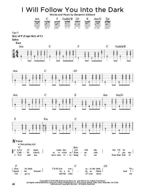 If you've learned the basics on guitar, you are probably eager to learn some songs. The First 50 series is for you! This book provides a combo of chords and lyrics for the most popular songs beginners want to strum on acoustic guitar. Includes: American Pie · Blowin' in the Wind · Daughter · Good Riddance (Time of Your Life) · Hey, Soul Sister · Home · I Will Wait · Losing My Religion · Mrs. Robinson · No Woman No Cry · Peaceful Easy Feeling · Rocky Mountain High · Sweet Caroline · Teardrops on My Guitar · Wonderful Tonight · You're Still the One · and more.