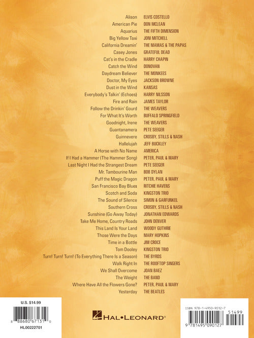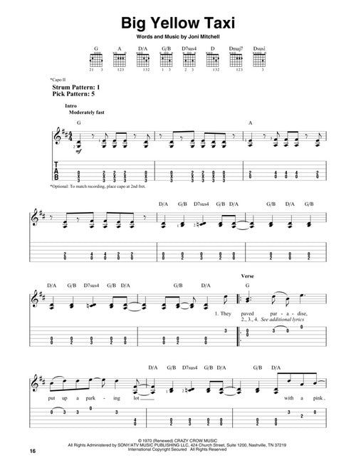 40 of the most memorable songs of the folk pop genre arranged for beginning guitar with notes and tablature. Includes: Alison (Elvis Costello) · American Pie (Don McLean) · Big Yellow Taxi (Joni Mitchell) · Cat's in the Cradle (Harry Chapin) · Fire and Rain (James Taylor) · Hallelujah (Jeff Buckley) · Mr. Tambourine Man (Bob Dylan) · Puff the Magic Dragon (Peter, Paul & Mary) · The Sound of Silence (Simon & Garfunkel) · This Land Is Your Land (Woody Guthrie) · We Shall Overcome (Joan Baez) · Yesterday (The Beatles) · and more.