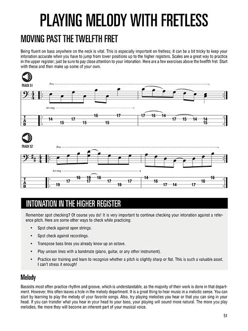 An ideal supplement to any bass method, this book with online audio uses 18 actual songs in various styles to teach key elements of the electric fretless bass, such as intonation; harmonics; keys, scales and intervals; and more. You'll learn to play in the style of Jaco Pastorius, Flea, Jack Bruce, Will Lee, Sting, Gary Willis, Tony Franklin, Jeff Ament and many others via 18 great songs: Bad Love · Continuum · Even Flow · Hocus Pocus · I Could Die for You · Jelly Roll · King of Pain · Kiss of Life · Lady in Red · Tears in Heaven · Very Early · What I Am · White Room · and more. The audio is accessed online using the unique code in each book and features 92 full-band tracks for demo & play-along.