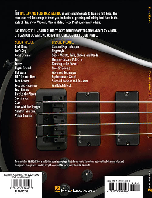 The Hal Leonard Funk Bass Method is your complete guide to learning funk bass. It uses real funk songs to teach you the basics of grooving and soloing funk bass in the style of Flea, Victor Wooten, Marcus Miller, Rocco Prestia, and many others. Songs include: Brick House · Can't Stop · Fire · Higher Ground · I'll Take You There · Let's Groove · Pick up the Pieces · Stay · Sumthin', Sumthin' · What Is Hip · and more.
