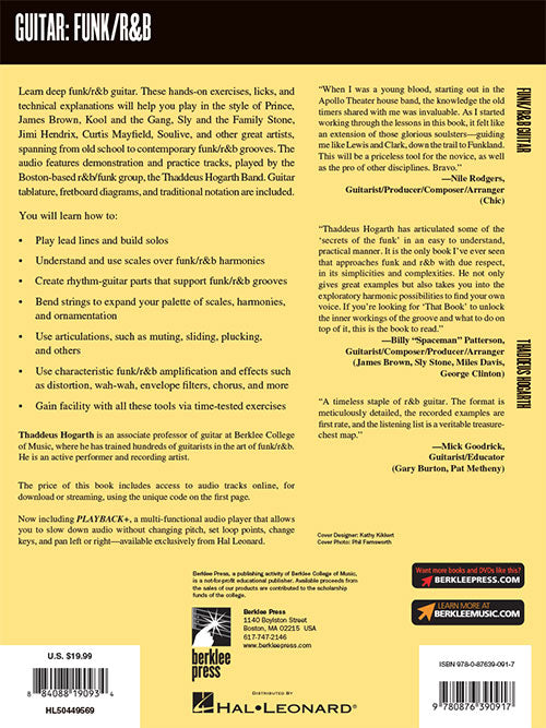 Learn deep funk/R&B guitar! These hands-on exercises, licks, and technical discussions will help you play in the style of Kool and the Gang, Prince, James Brown, Sly and the Family Stone, Jimi Hendrix, Curtis Mayfield, Soulive, and other great artists, spanning from old school to contemporary funk/R&B grooves. The audio features demonstration and practice tracks, played by the Boston-based R&B/funk group the Thaddeus Hogarth Band. Guitar tablature, fretboard diagrams, and traditional notation are included. You'll learn how to: play lead lines and build solos; understand and use scales over funk/R&B harmonies; create rhythm-guitar parts that support funk/R&B grooves; bend strings to expand your palette of scales, harmonies, and ornamentation; and much more! The audio is accessed online using the unique code inside each book and can be streamed or downloaded. The audio files include PLAYBACK+, a multi-functional audio player that allows you to slow down audio without changing pitch, set loop points, change keys, and pan left or right.