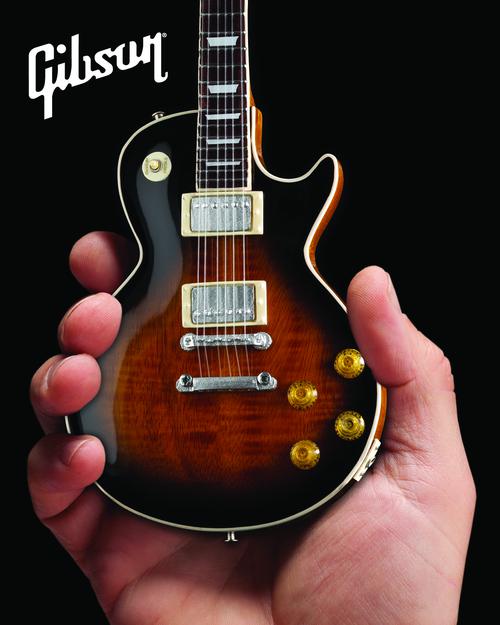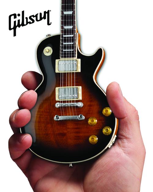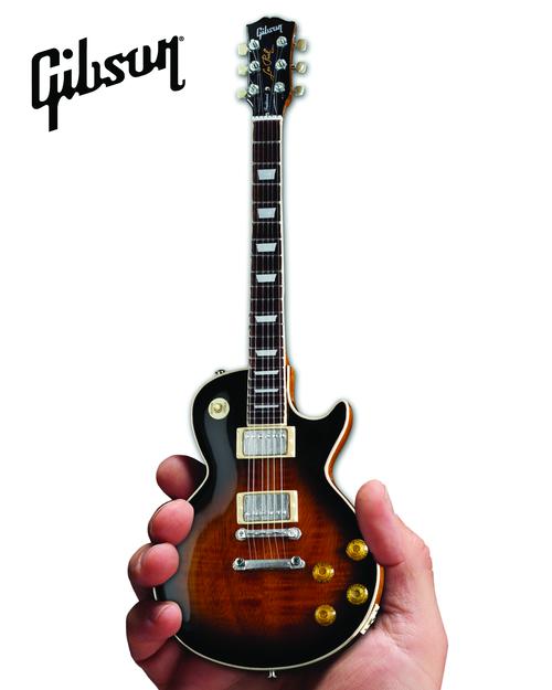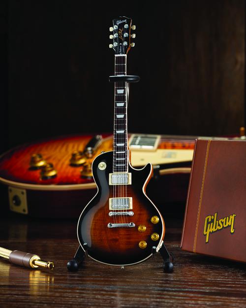These miniature replica model guitars are officially licensed to commemorate iconic Gibson(TM) instruments. Each 1:4 scale ornamental replica guitar is individually handcrafted with solid wood and metal tuning keys. Each guitar model is approximately 10-inches in length and comes complete with a high-quality miniature adjustable A-frame stand and guitar case gift box. Axe Heaven Miniature Replicas look great, but are not playable.