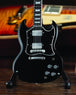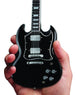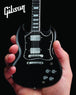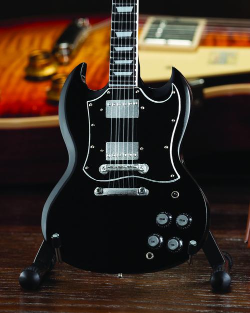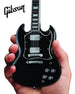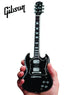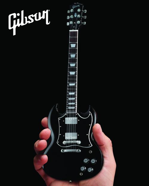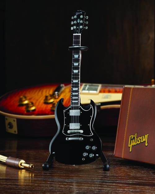 These miniature replica model guitars are officially licensed to commemorate iconic Gibson(TM) instruments. Each 1:4 scale ornamental replica guitar is individually handcrafted with solid wood and metal tuning keys. Each guitar model is approximately 10-inches in length and comes complete with a high-quality miniature adjustable A-frame stand and guitar case gift box. Axe Heaven Miniature Replicas look great, but are not playable.